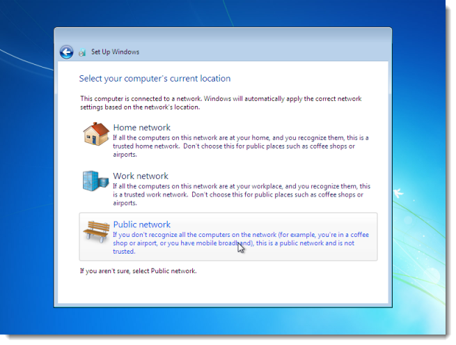 | Pilihan ni kalau komputer anda sedang connected pada network. Kalau tak nak fikir banyak, pilih sahaja Public Network. (Benda ni boleh juga diubah kemudian) |